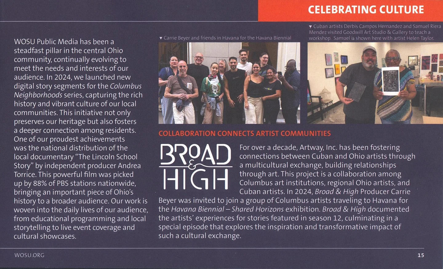 WOSU’s Broad & High is an Emmy Award-winning magazine show that highlight’s artists in Columbus and beyond. Broad & High producer, Carrie Beyer joined Ohio artists traveling to Havana for the 15th Bienal del la Habana – Shared Horizons. Broad & High documented the artists’ experiences for stories featured in Season 12, culminating in a special episode that explores the inspiration and transformative impact of such a cultural exchange. The video team was also able to record some interviews with Cuban artists to include in the series.